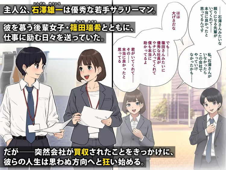 中性的な外見をした優秀なサラリーマン・石澤雄一が、変態社長の手によって淫乱女装OLに堕とされるストーリー。脅迫によって拒めない雄一を一方的にメス化調教し、アナル開発で性の快楽を叩き込む。もう引き返せないレベルまで堕とされた雄一は「花澤由依」という偽名でOLとして働かされることに。淫乱女装OLになった雄一がさらなる快楽を求めてメス堕ちしてゆく人気エロCG。女装フェチや男の娘好きにおすすめ。