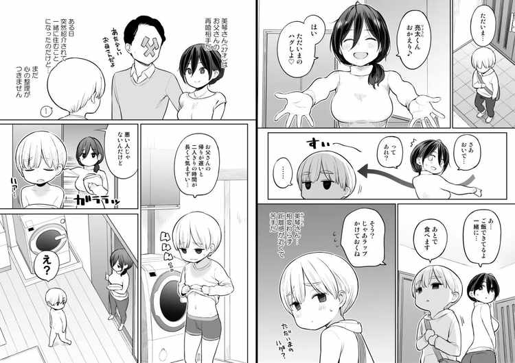 おねショタストーリーと言えばひぐま屋先生ですね。今回は義母とショタの息子が肉体関係を持ち、親子以上の関係に突入する物語。父の新しい結婚相手・美琴さんは27歳。義理の母親になった彼女に素直に接することができない亮太くん。何とか家族のような関係になりたいと考えた美琴さんは亮太くんがいるお風呂に突入。そこで、おっぱいを揉ませ手コキで射精。義母で精通してしまった亮太くんが男になって義母とセックスにのめり込んでゆく。父の再婚相手で童貞を捨てるだけでなく、家庭内セフレとしてこれからも関係が続いていきそうな二人です。