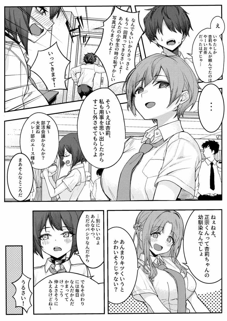 小さい頃は仲良しだった幼馴染の女の子。しかしJKになった今では彼女のイジメの標的になりパシリ扱いされるように。そんな学校生活を送る中で彼女の取り巻きである太刀川さんに声を掛けられる。誰もいない学校の一室に連れ込まれ、要求されたのはこの身体。パシリとして従順な主人公に対してムラムラが抑えきれなくなってしまったショートカットJKが攻めるエロ同人。