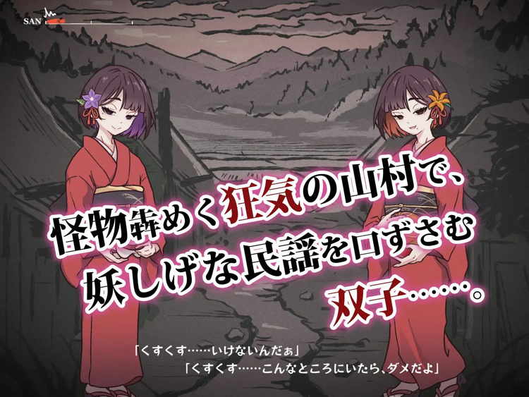 ミステリアスでホラーな因習村の入り口。主人公の前に現れたのは着物姿の双子の少女。ヒントが含まれている手毬唄を歌うことが役割のNPCである。しかし、二人ともなかなかの可愛さ。お持ち帰りして嫁にする。というわけで双子の少女を孕ませるエロCG。正ヒロインよりNPCに魅力を感じてしまうかたにおすすめ。