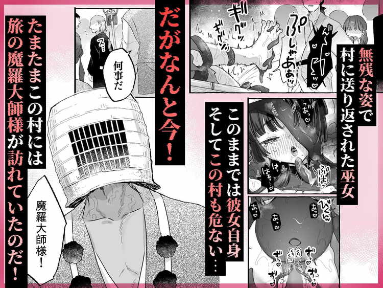 勇ましく魔瘴退治に向かった退魔の巫女。しかし、即負け惨敗で即堕ち展開。しかし、そこに現れたのは魔羅大師様。闇堕ち寸前だった巫女に、魔瘴よりも気持ちいい快楽の波が押し寄せる。儀式による強制性交でしっかり救済されてハッピーエンド。
