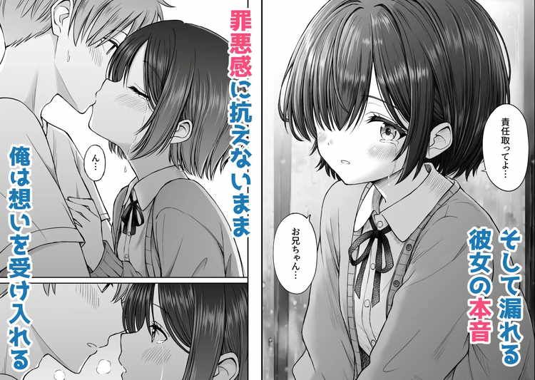 親の再婚で義理の妹ができた。心を開かない無表情で無口な義妹・蒼衣と、ぎこちない同居生活を送ることになったお兄ちゃん。ある雨の日、ずぶ濡れになって立ち尽くす蒼衣。声をかけたものの走って逃げだされてしまう。その日の夜、蒼衣の本心を聞かされて自分がい場所になることを告げる。そして、二人は義兄妹のラインを越えて肉体関係に。ツルツルの割れ目に顔を埋めてクンニで優しく愛撫してあげると絶頂を迎えた義妹。そのお返しにと懸命なフェラチオで愛情を示す蒼衣。我慢できなくなったお兄ちゃんは、ゴム無しの生挿入で義妹と一つに。密着する幸せを感じながら対面座位で中出しフィニッシュ。おとなしい義妹ですが、エッチに関してはなかなか積極的でした。これから雨の日はたくさんエッチする約束をしてハッピーエンド。中出しは大胆ですね。