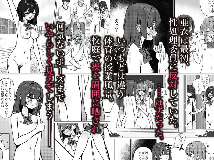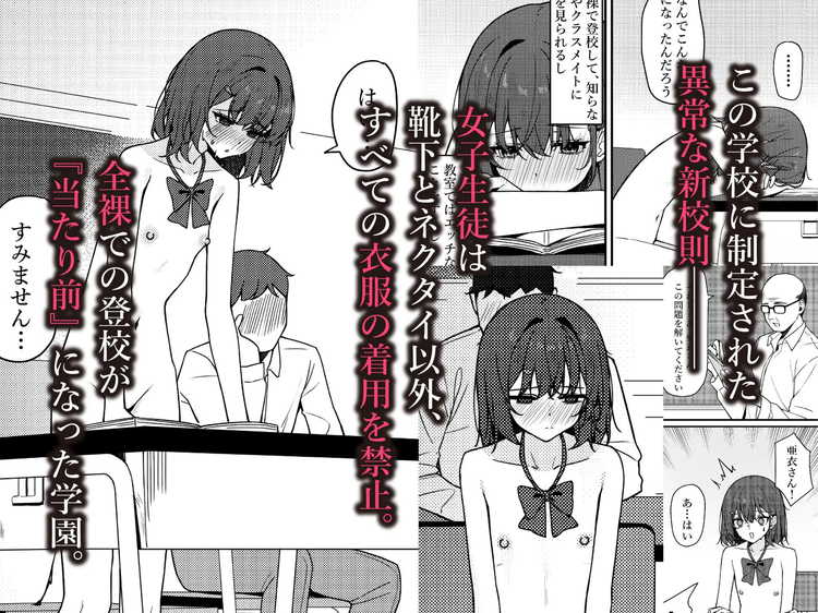 性欲旺盛、エロに興味津々。そんな男子学生たちが多数いる学校に全裸の女学生を投入したら当然理性は崩壊。服を着なくても問題のない世界だとしても、青少年の性欲を抑えるのは不可能です。それは男性教師だって同じ。可憐で清純な女学生たちの全裸を目の当たりにした男子たちはどのような行動にでるのか。常識改変、アブノーマルが普通の世界をお楽しみください。