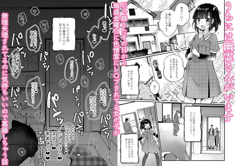 中古の一軒家に引っ越してきたとある家族。自分の部屋を持てることに大喜びの少女だったが、その日の夜に霊に無理矢理気持ちよくされてしまう。つるぺた女子の小さなお尻をガンガン突きまくる色情霊。無理矢理されてるのに気持ちよくなってしまい、その日以降も関係を持ち続けてしまうことに葛藤し続ける少女。朝までひたすらセックスを強いられ、綺麗な割れ目を精液まみれにされながらも芽生える感情。プレイは結構激しいけど、気持ちよさそうに感じてしまう女の子を描いたエロ同人の総集編。