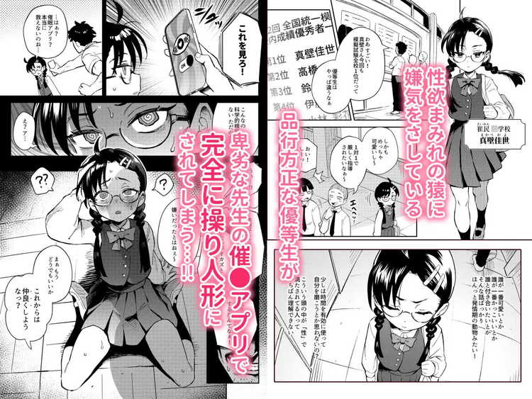 性欲やエロとは無縁の真面目で品行方正な女学生が堕ちる姿を見てみたい。そんな方にお勧めのエロ同人。同年代の男子は発情期の猿。そんな印象を持ち、男子を見下していた優等生のクラス委員長・真壁佳世は担任教師を告発しようとしていた。しかし、先生の催眠によって調教され、ウブな体は開発されてゆく。催眠アプリによって命じられるがまま従っていた委員長ですが、やはり素の状態の委員長を調教したいという男の欲望がさらなるエロスへと突入してゆく。スレンダーな眼鏡女学生が躾られ、放尿から中出しまであらゆるプレイを強いられるエロ同人。
