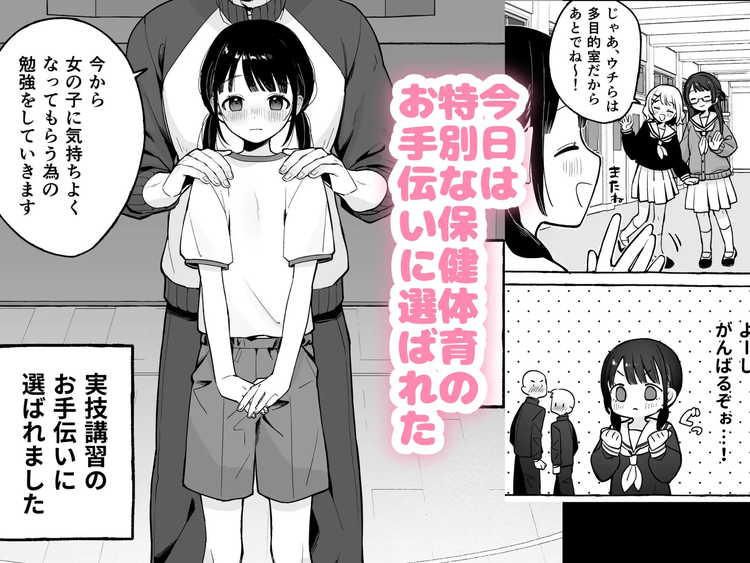 男子学生の夢。それは保健体育の実技講習。同級生の女子が先生と性行為することで女になる瞬間を目の当たりにする。少し膨らんだ胸、暖かくてヌルヌルした膣、聞いたことのない声を漏らして気持ちよさそうに感じている女子を見て男子の股間もギンギンです。先生からセックスのお手本を教わった後はいよいよ自分たちの実技を披露。クラスメイトの男子と女子が男女の関係になる様子を描いた人気エロ同人。