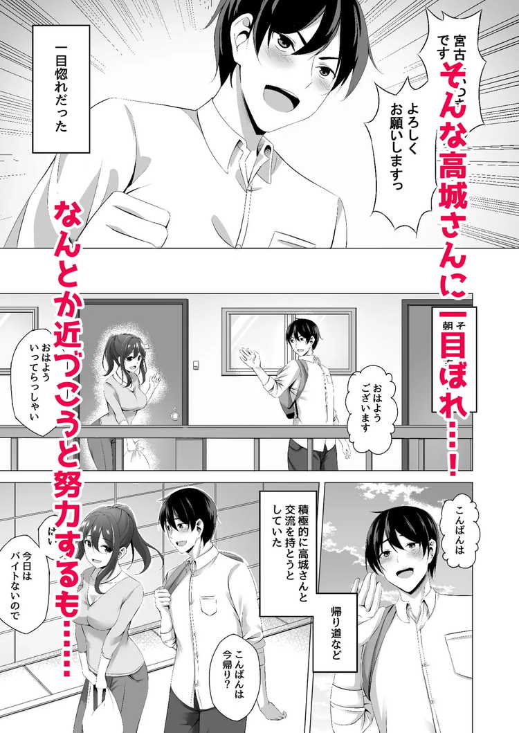 引っ越しの挨拶をしに隣の部屋に行ったら綺麗で若い人妻さんが出てきた。そして、高城さんに一目惚れしてしまった主人公はそれから積極的に挨拶をするように。ある日、宅飲みに誘われたので一気に仲良くなるチャンスと意気込んでいたら、酔った勢いで中出しセックスに。まだまだ若い高城さんの巨乳を堪能しながら人妻の味を知るエロ同人。やっぱり未亡人は欲求不満なのかもしれません。