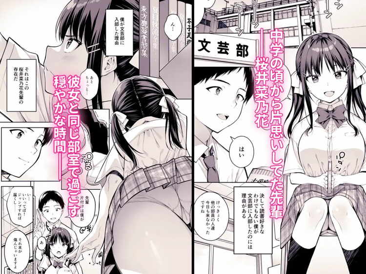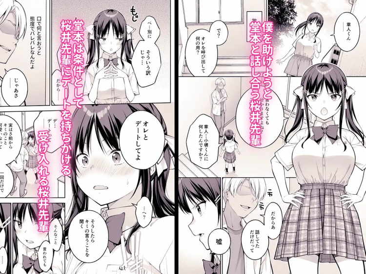 主人公・小堺が、ずっと想いを寄せていた桜井菜乃花先輩が寝取られ処女を奪われ中出しされるNTRエロ同人。小堺に金をせびり暴力も振るっていたヤンキー堂本。その現場を目撃した桜井先輩が、小堺を助けるために堂本と話し合った結果「デートしてくれたら言うことを聞く」という提案を受け入れる。しかしそれが悪夢の始まりだった。無理矢理の処女喪失、一方的なセックス、学校でも体を求められる日々。そして、セックスの気持ちよさを覚えてしまう桜井先輩。興奮します。