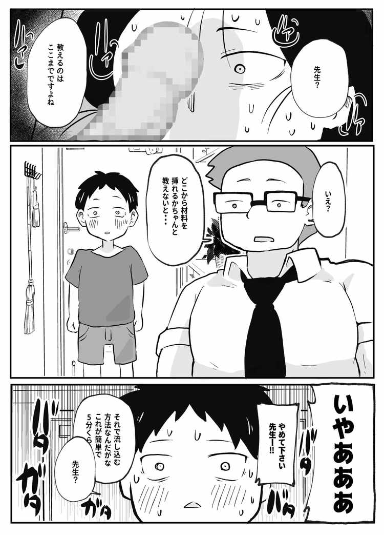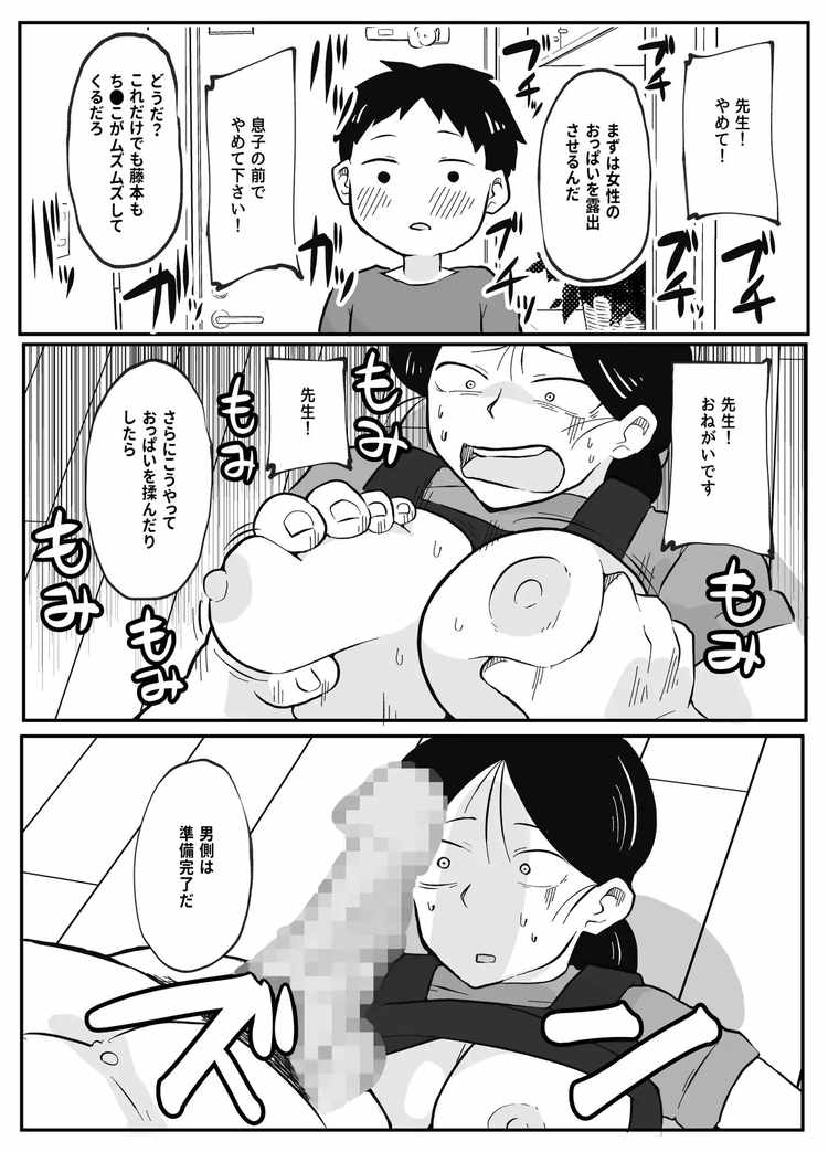 先生に「赤ちゃんのつくり方」を聞いた好奇心旺盛な年頃の藤本。先生は「じゃあ今日の放課後、藤本の家に行くか」というわけで課外授業が始まった。自宅のドアを開けるとお母さんが登場。挨拶と課外授業についての説明を終えると、先生はお母さんを押し倒した。淡々と進んでゆく授業、悲鳴を上げるお母さん、いったい何がどうなっているのか藤本には理解できない。ひとつだけわかるのは、お母さんが嫌がっていることだけ。生徒の母親を教材にして子作りを行い、妊娠させようとする先生がヤバすぎる。でも、生々しいシチュエーションと背徳感がエロい。