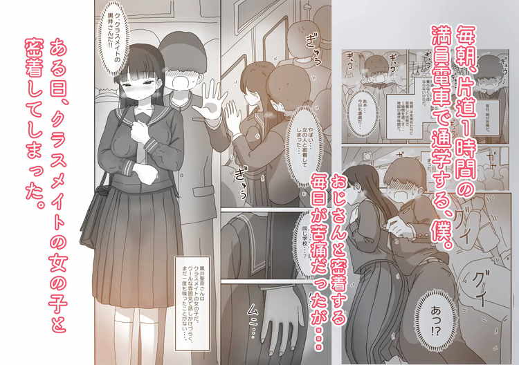 いつもの通学路、いつもの満員電車。しかし、今回違ったのは電車内で密着したのはクラスメイトの女子・黒井さんだった。黒髪で清楚な黒井さんのお尻はとても柔らかくてうっかり揉んでしまう主人公。「いいよ、気にしないで」黒井さんの意味不明なセリフを聞いた主人公の性欲は暴走寸前。長い制服のスカートをめくりあげ熱い精液をぶちまけるほどに盛り上がってしまうストーリー。性に寛容なクラスメイトの清楚系女子はそそりますね。電車で密着したセーラー服女学生のスカートの中に射精するのも興奮しそう。